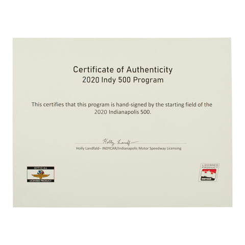 This 2020 Indianapolis 500 racing program, signed by the full field, is a must-have for any motorsports enthusiast. Featuring official race details, driver profiles, and stunning images, this limited-edition program has been personally autographed by the full field, adding a rare and valuable touch to your collection. Whether you're a long-time fan of the sport or just starting your journey into racing, this autographed program is a unique piece of memorabilia that celebrates the speed, passion, and excitement of the racing world. Don’t miss out on owning a piece of history – perfect for display or as a centerpiece in any motorsports collection!